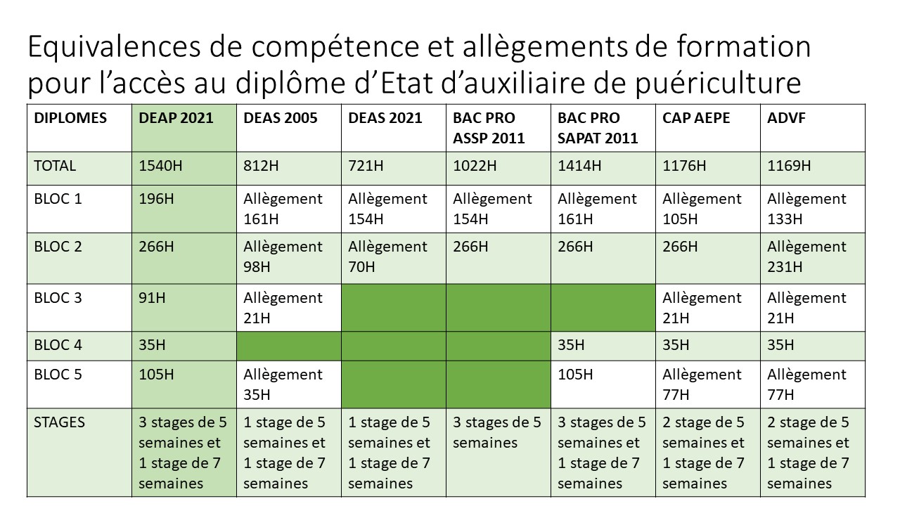 - Formation personnalisée en fonction des équivalences liées aux diplômes antérieurement acquis par l’élève (DEAS, CAP AEPE, BAC ASSP, ADVF)